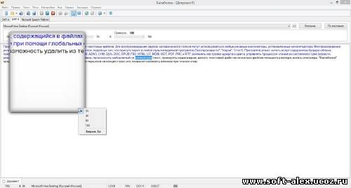 Дополнительная информация: Программа умеет читать вслух содержимое буфера обмена, показывать текст, содержащийся в файлах форматов AZW, CHM, DjVu, DOC, EPUB, FB2, HTML, LIT, MOBI, ODT, PDF, PRC и RTF, изменять настройки шрифта и цвета, управлять процессом чтения из системного трея (области уведомлений) или при помощи глобальных сочетаний клавиш, произносить набираемый на клавиатуре текст, проверять орфографию, делить текстовый файл на несколько файлов меньшего размера, искать омографы. "Балаболка" предоставляет возможность удалить из текста все знаки переноса на концах строк; это позволит избежать запинок при чтении слов.