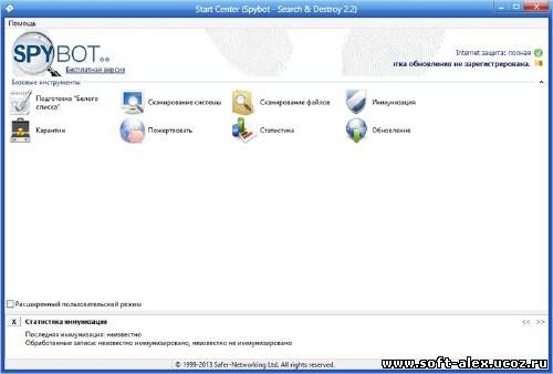 Интерфейс прост и удобен: кнопок и управляющих меню - минимум, работать с программой не составляет труда. Перед проверкой системы на присутствие в ней шпионских модулей советуем сделать копию реестра. В программе также возможен откат, благодаря чему вы всегда можете вернуть ключи и файлы, которые были удалены. Несмотря на свою бесплатность, Spybot - Search & Destroy является одним из признанных лидеров в своей категории.