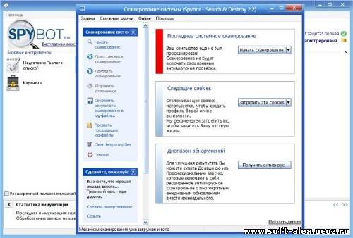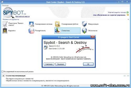 Spybot - Search & Destroy - утилита для поиска и удаления программ-шпионов (spyware), рекламных вставок (adware), программ-похитителей данных (hijackers) и иного вредоносного софта. Spybot - Search & Destroy сканирует жёсткий диск и реестр операционной системы, находя там шпионские модули и вредоносные ключи. База данных приложения постоянно обновляется разработчиками подобно обновлению антивирусных программ.